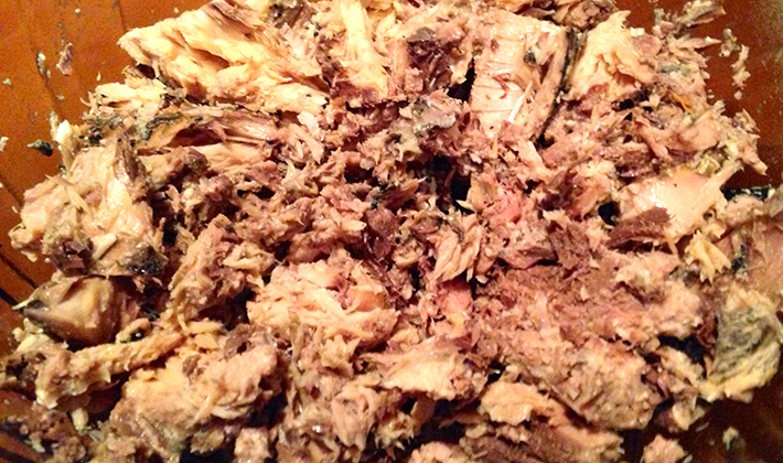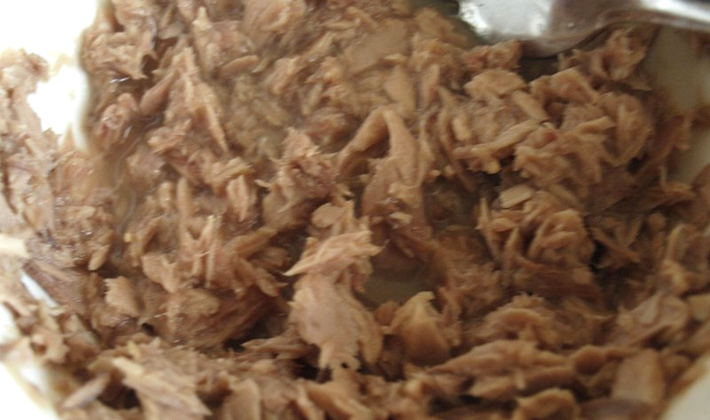 Écraser le poisson sans liquide avec une fourchette et broyer avec de la mayonnaise.