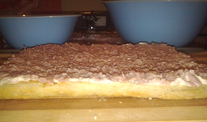 Versez un peu de farine sur la table, étalez-la sur la surface. Mettez la pâte sur la farine, roulez-la en un rectangle de 20 à 30 cm, avec un couteau, donnez aux bords une forme uniforme.