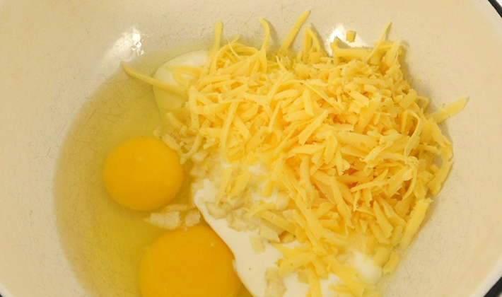 Bien mélanger la crème sure, les œufs, le fromage râpé et verser le mélange dans un moule.