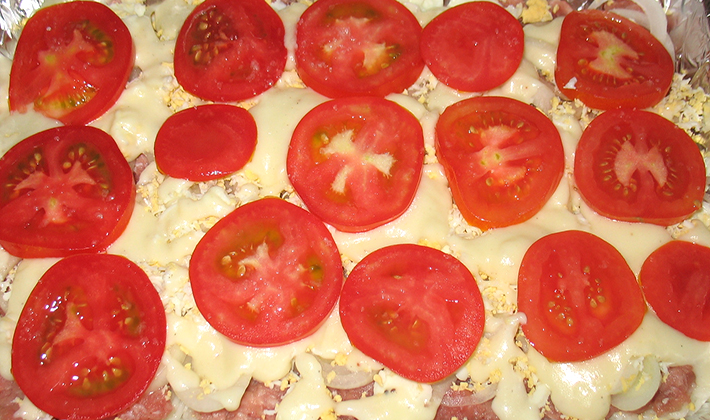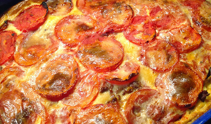 Répartir les tomates coupées en tranches fines sur le dessus.