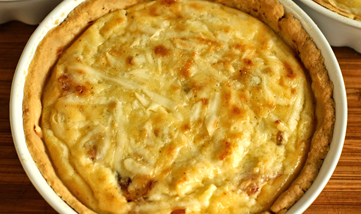 Une tarte ouverte au poulet et aux champignons, faite de pâte brisée aux oignons verts, à la crème sure, au persil et à la ciboulette, est appelée Noyon.