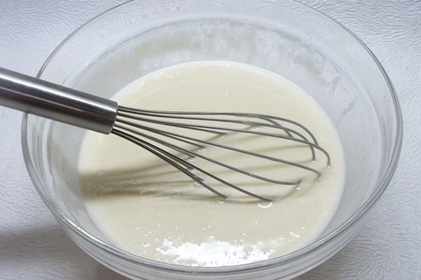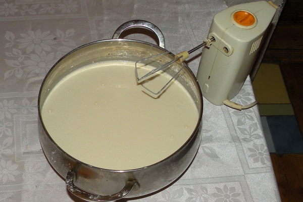 La pâte peut être préparée manuellement ou avec l'aide d'assistants de cuisine, par exemple un mélangeur. Tout d'abord, mettez les œufs, le sel et le sucre dans un bol ou un bol d'un mixeur et battez bien. Ajoutez ensuite le lait chaud et la farine tamisée dans le récipient. Tous les ingrédients doivent être bien battus jusqu'à ce qu'une masse d'air homogène sans grumeaux soit ajoutée et que de l'huile végétale soit ajoutée.