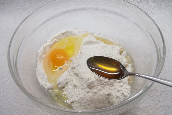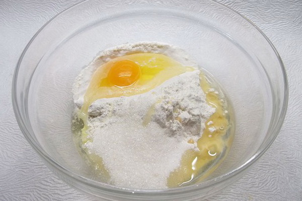 Tout d'abord, vous devez mélanger le kéfir, l'oeuf, le sel et le sucre dans un bol. Dans un récipient séparé, mélanger la farine et l’amidon jusqu’à consistance lisse. Ajoutez cette masse sèche au mélange de kéfir et d’œufs obtenu et mélangez bien.Après cela, ajoutez du soda, mélangez à nouveau et ajoutez de l'huile végétale au mélange.