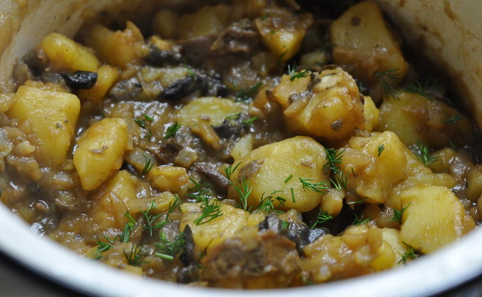 Les pommes de terre épluchées crues sont coupées en cubes ou en tranches de taille moyenne et frites. Préparé cèpes champignons fraistranchés en tranches sont frits. Les champignons séchés sont bouillis puis frits. Des champignons sautés sont ajoutés aux pommes de terre, des oignons sautés, des rondelles ou des tranches coupées en rondelles, et versés avec de la sauce rouge ou tomate), mettez les épices et le ragoût jusqu'à cuisson complète. Les tomates rôties sont placées à côté ou autour des pommes de terre en vacances. Le plat peut être cuit sans tomates.