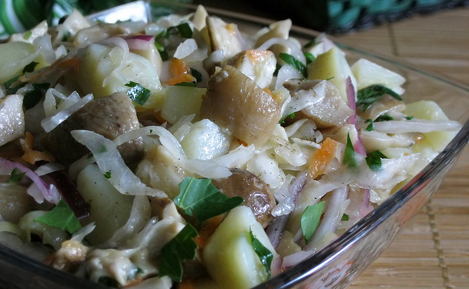- Champignons salés avec pommes de terre, chou et concombres