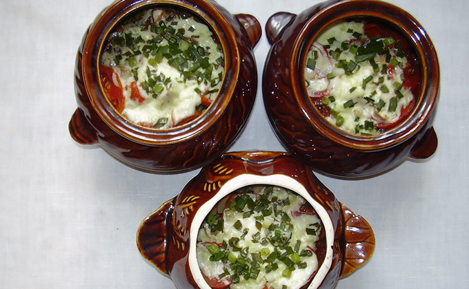 - Dans des pots en argile, mettez les pommes de terre coupées en gros morceaux, puis une couche de champignons, une couche de tomates coupées en fines tranches, puis quelques cuillères à soupe de crème sure, mettez les pommes de terre à nouveau et versez sur la crème sure.