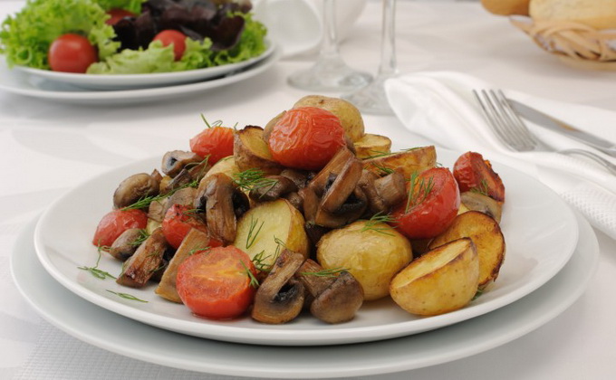 Lorsque vous servez des champignons cuits avec des pommes de terre et des tomates, versez la sauce dans laquelle ils ont été cuits. À moins, bien sûr, que tout le liquide se soit évaporé. Ensuite, saupoudrer d'herbes hachées et d'ail.