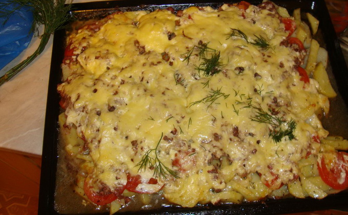 - Nous étalons la moitié des pommes de terre graissées, puis des tomates, des oignons, des champignons et des pommes de terre. Saler chaque couche, saupoudrer de poivre.