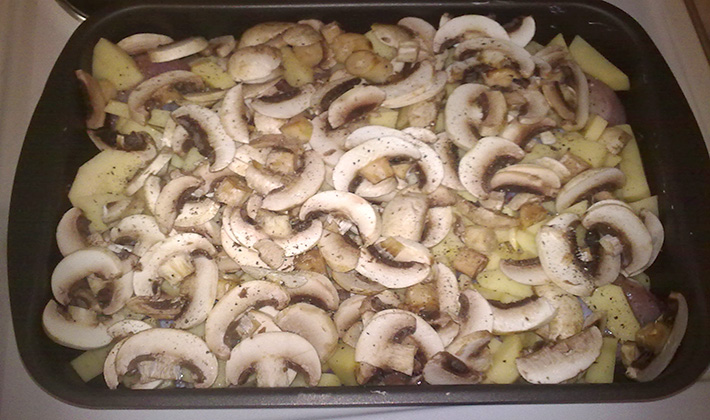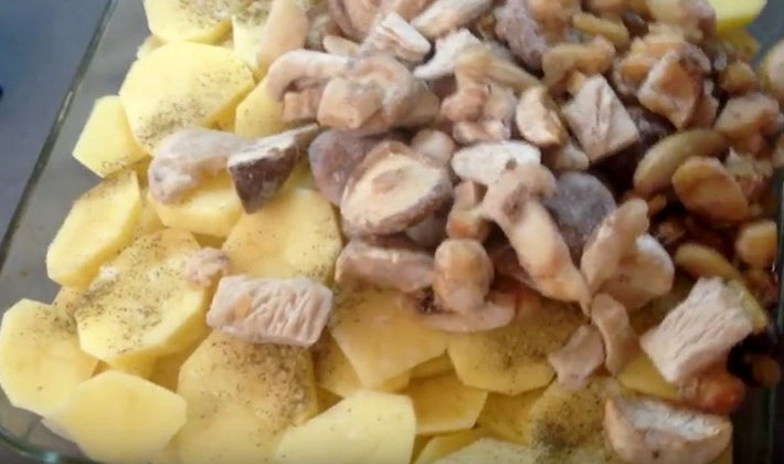 Mettez de la graisse et une couche de pomme de terre coupée en rond sur le fond de la machine à oie, sur elle une couche de champignons avec des oignons et de la viande, puis encore une couche de pommes de terre et une couche de champignons, d'oignons et de viande.