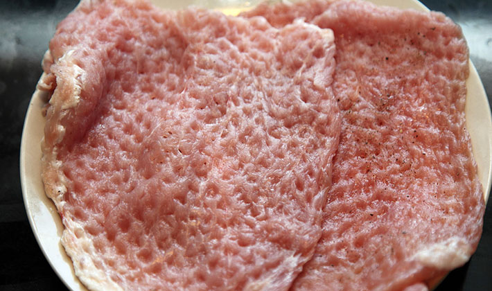 Lavez la viande, retirez le film, coupez-la en tranches, battez, salez, roulez la farine et faites la frire dans une poêle bien chaude.