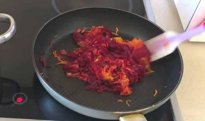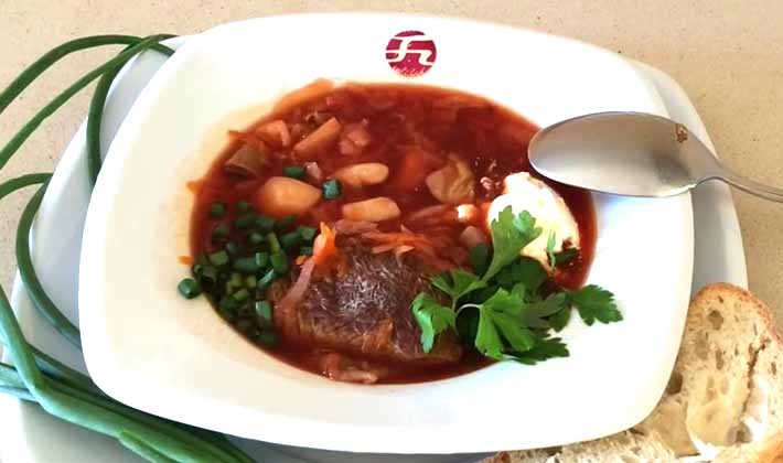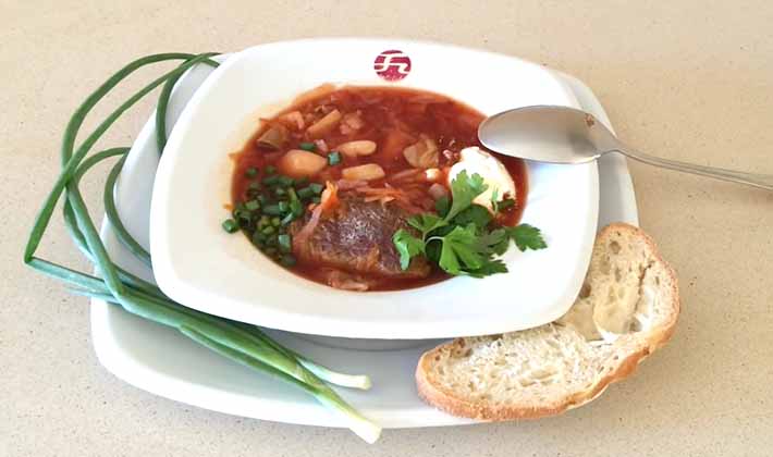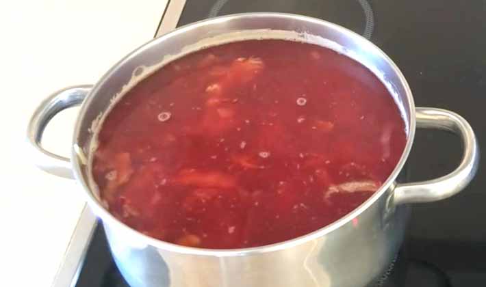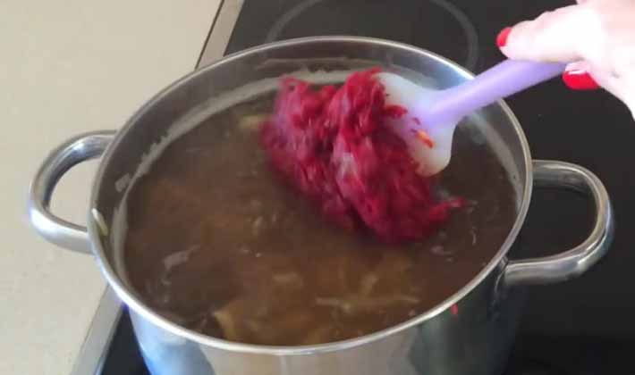 Coupez les betteraves cuites en lanières, saupoudrez de vinaigre et faites sauter, coupez les pommes de terre en tranches oblongues, faites cuire dans le bouillon jusqu'à tendreté, ajoutez à l'oignon émincé, de la farine mélangée avec un peu d'eau froide.