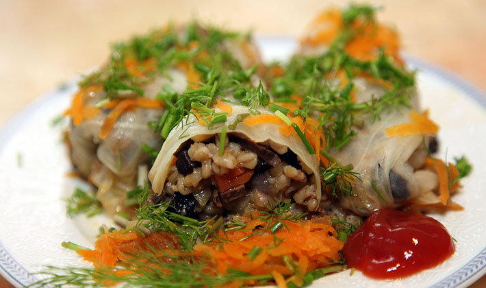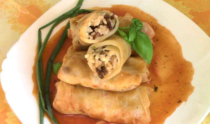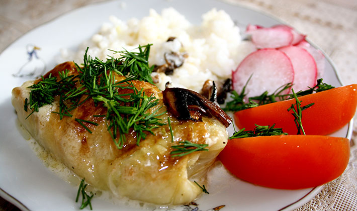- Mettez les rouleaux de chou préparés dans une rôtissoire profonde, graissés avec de l'huile végétale, saupoudrez de verdure hachée finement, versez la sauce tomate et faites cuire au four jusqu'à cuisson complète.