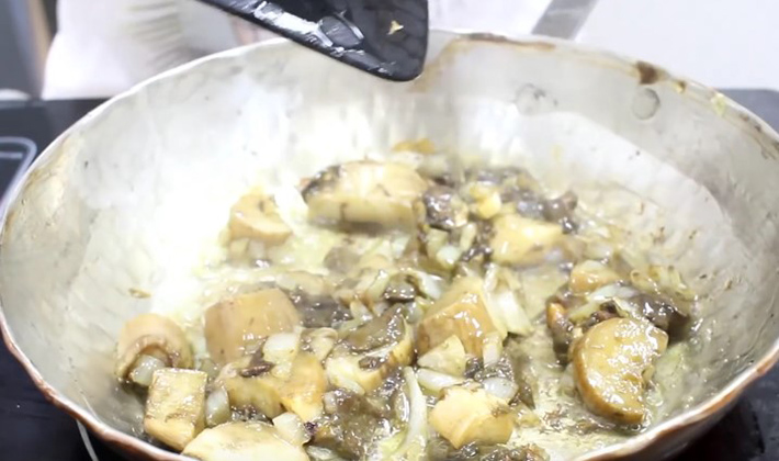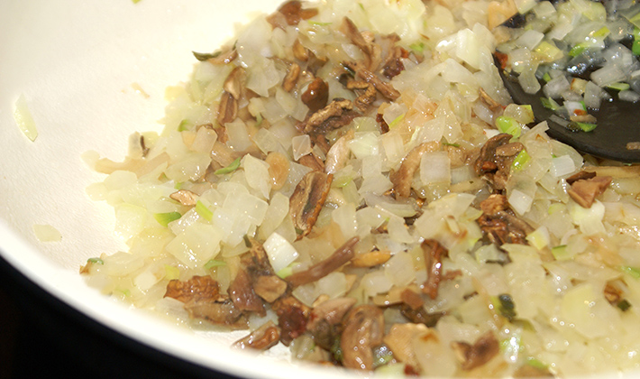 - Rincez les champignons, hachez-les finement, faites-les frire dans de l'huile végétale avec des oignons émincés, salez.