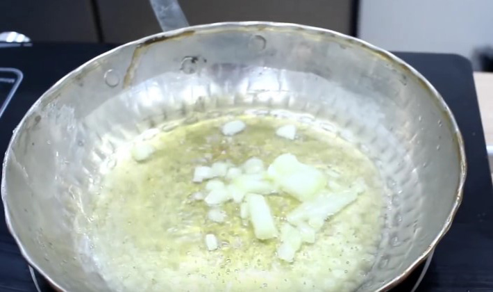 Épluchez l'oignon, rincez-le, hachez-le finement, mettez-le dans une casserole et faites-le frire dans l'huile chaude.
