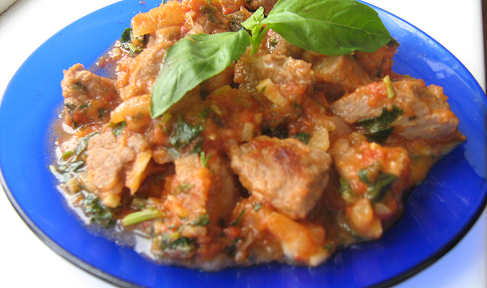 Ragoût de racines et d'oignons grossièrement râpé avec du porc en dés. Couper la viande en portions, faire frire dans la graisse, ajouter la purée de tomates, les légumes cuits, le bouillon, le vin et laisser mijoter dans un récipient scellé jusqu'à ce que le mélange soit prêt (environ 1 heure). Ensuite, mettez les champignons hachés et laissez mijoter encore 10-15 minutes. Transférer la viande finie dans un plat. Au jus restant après la cuisson de la viande avec les légumes, ajoutez les verts et la crème sure et servez-les dans une saucière.