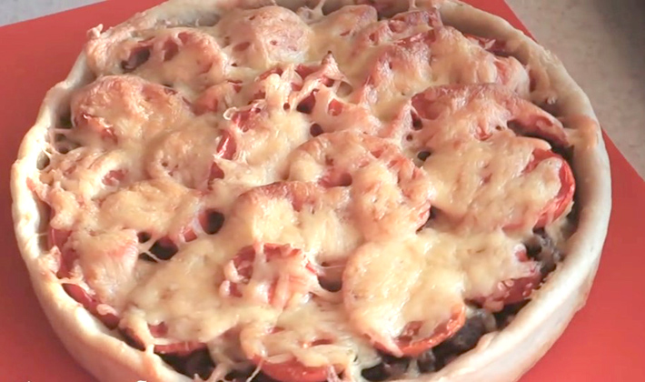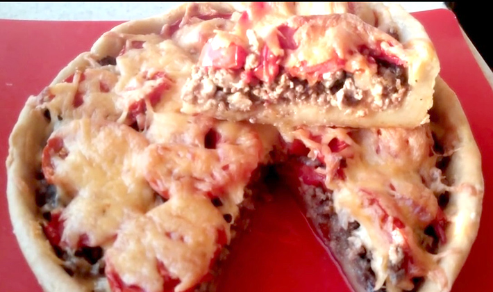 Préparez de la viande hachée et du pain trempé dans du lait. Salez, poivrez, ajoutez les oeufs crus et mélangez bien. Sur la feuille de papier d'aluminium (ou de film plastique), posez la farce avec une couche de 1 cm et nivelez-la. Graisser avec de la mayonnaise et saupoudrer de fromage râpé. Sur la viande hachée, déposez des lanières de légumes frits, des champignons, des œufs durs hachés et des cornichons hachés.