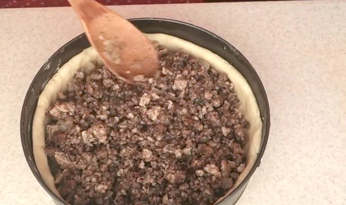 Le fond et les parois de la forme graissée sont recouverts de purée de pommes de terre. Au milieu, des empreintes sont placées et un mélange de viande et de champignons y est mélangé.