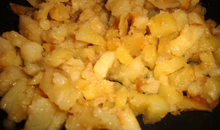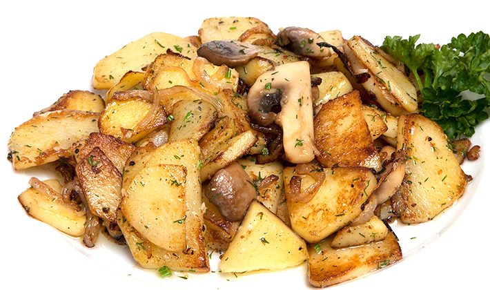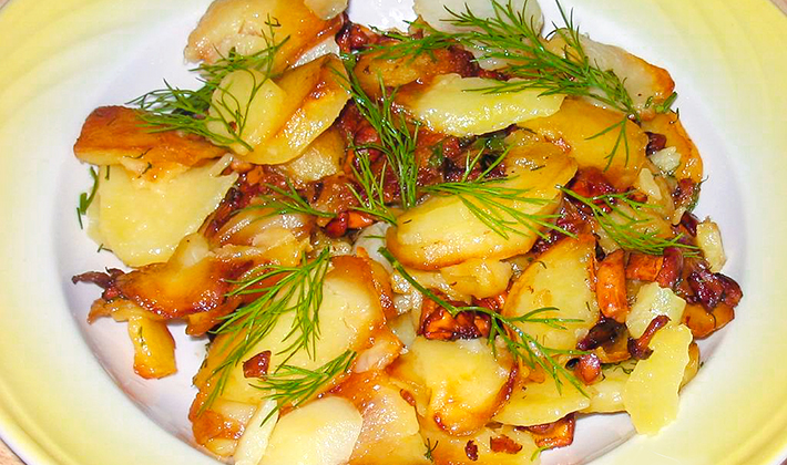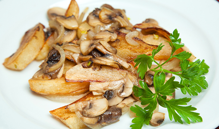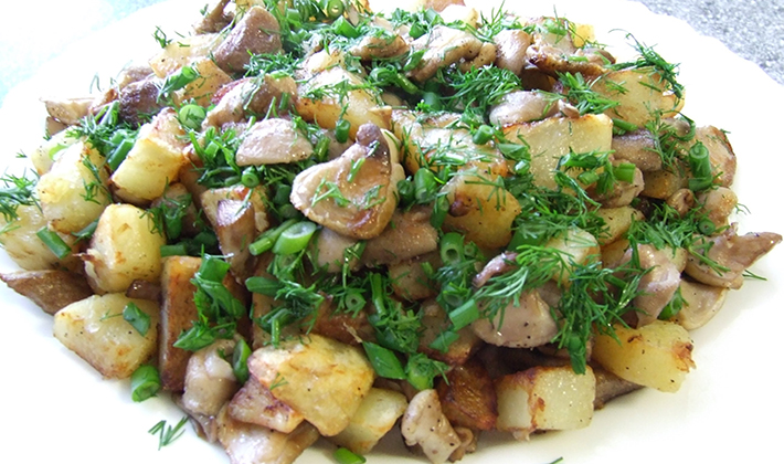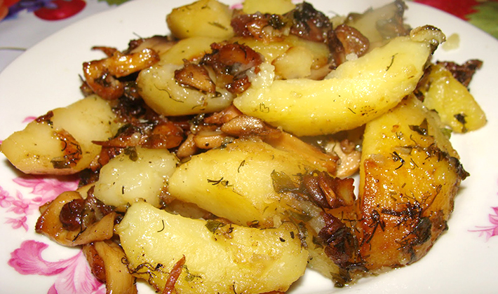 Épluchez les pommes de terre et coupez-les en cubes (cercles, tranches ou petits cubes). Faites-le frire avec la graisse en le retournant de sorte qu'il soit complètement bruni. Saupoudrer de sel après qu'il soit légèrement frit. Hachez l'oignon, faites-le frire dans l'huile et mélangez-le avec les pommes de terre. Étendre les champignons finement hachés et frits sur le reste du beurre.