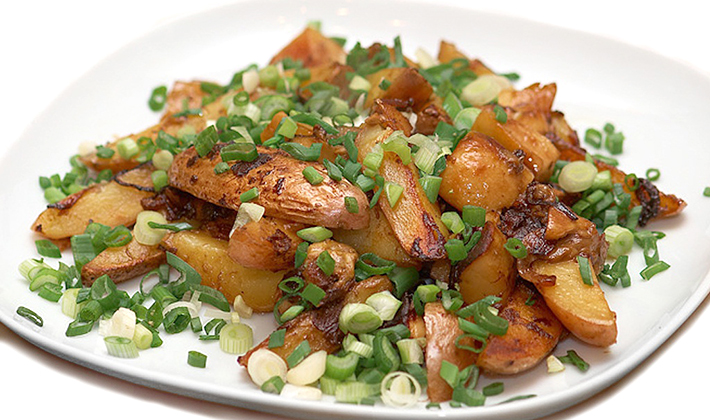 Faites bouillir les pommes de terre, coupez-les en petits cubes et faites-les frire avec du bacon pour obtenir une croûte dorée.