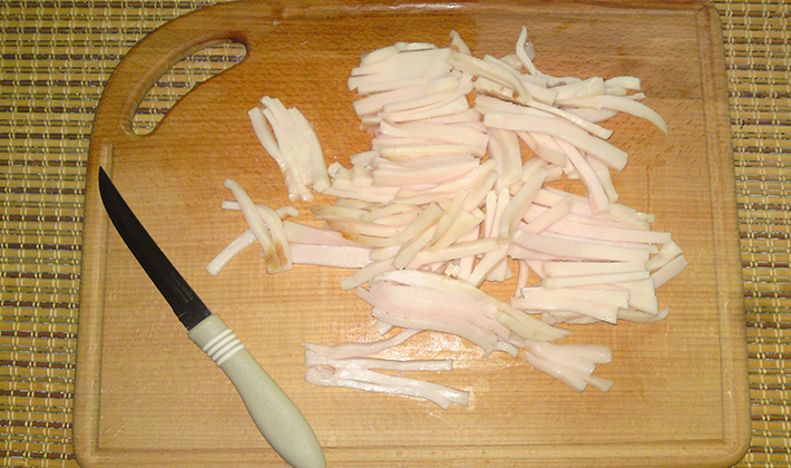 Couper le lard en lanières.