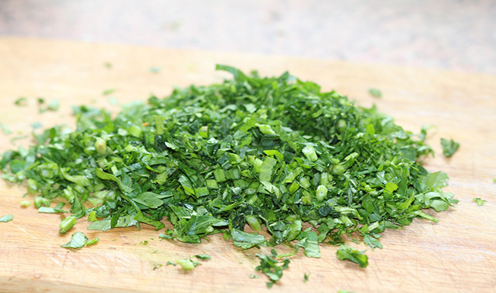 Pelez l'oignon et la racine de persil, lavez-les, hachez-les finement.
