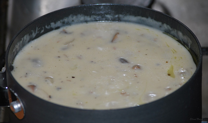 - Versez le bouillon chaud, ajoutez le jus formé lors de la torréfaction de l'oiseau, faites cuire la sauce aux cèpes avec la mayonnaise à feu doux pendant 2-3 minutes en remuant constamment.