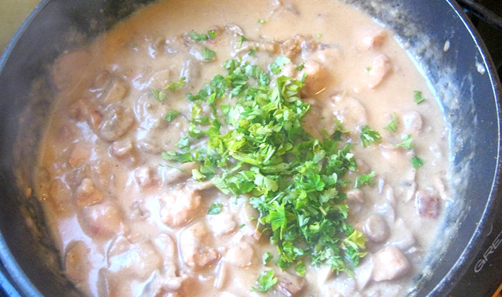 Ajouter le jus de viande, la crème sure, les champignons marinés, le reste du beurre, le persil et le poivre. Mélanger.