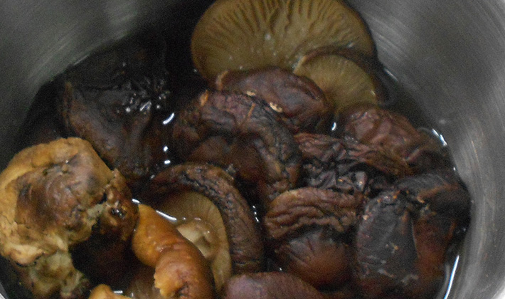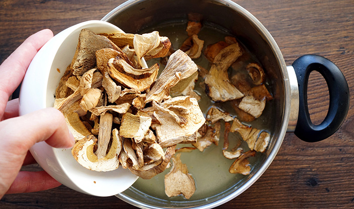 Les champignons séchés lavés à l'eau tiède doivent être trempés dans trois verres d'eau froide pendant 2-3 heures