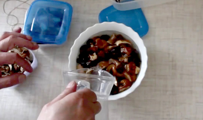 Verser les champignons avec de l'eau bouillante et laisser gonfler pendant plusieurs heures, laisser bouillir pendant 10 minutes, filtrer le bouillon.