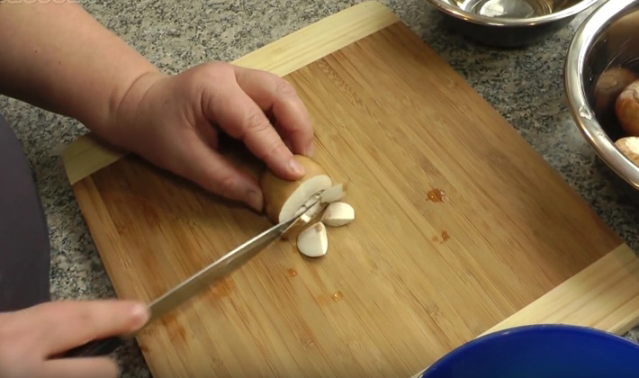 - Couper les oignons et les champignons préparés avec des cubes ou des tranches de taille moyenne.