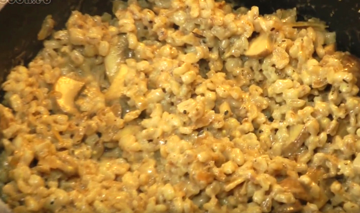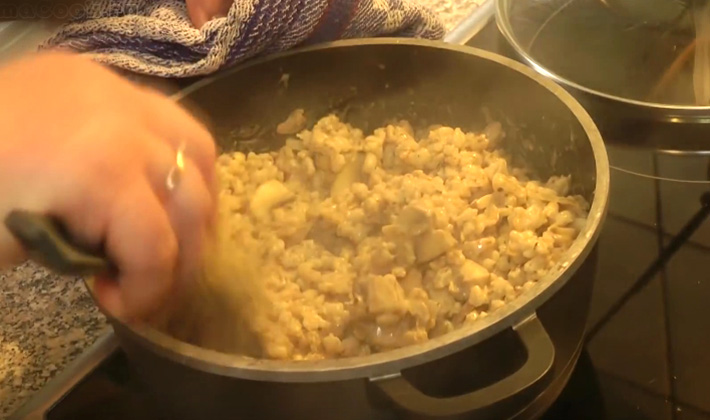 Orge aux cèpes séchés dans une casserole