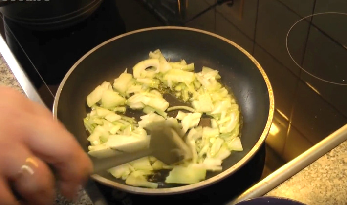 Faire revenir l'oignon coupé en dés dans l'huile végétale jusqu'à tendreté, ainsi que les champignons.