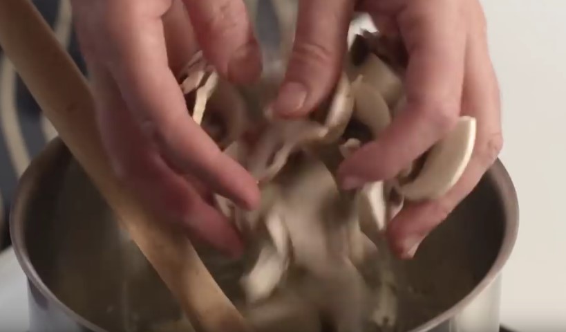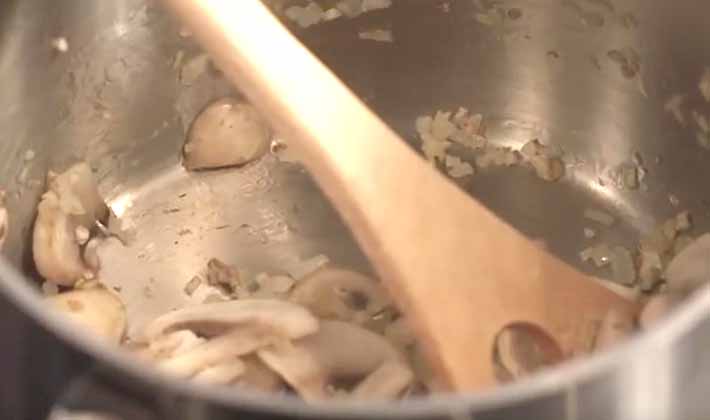Puis versez le bouillon au cognac et aux champignons sans cesser de remuer.