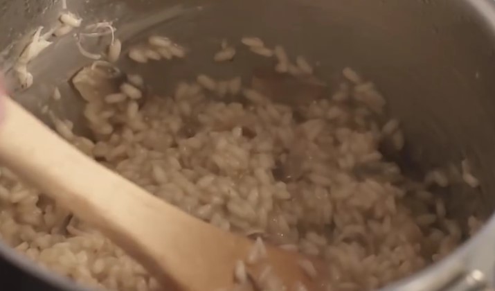 3 minutes avant que le riz soit prêt, ajouter le beurre, le parmesan râpé, le mascarpone et bien mélanger jusqu'à ce que la cuisson soit terminée.