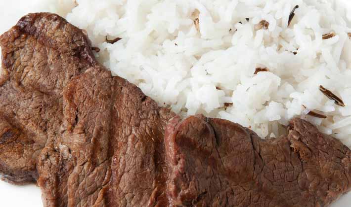 Couper la viande en fines tranches, mélanger à l'ail et au persil finement hachés, aux carottes et aux oignons. Ajouter le sucre et le sel, le poivre. Laisser reposer la viande pendant 1 heure, puis cuire les champignons et laisser cuire à feu vif. Égoutter le bouillon, ne laissant que le fond, ajouter les champignons et l'huile. Servir le rôti de boeuf avec les champignons porcini et le riz friable.