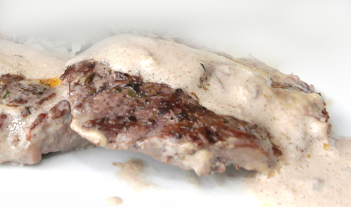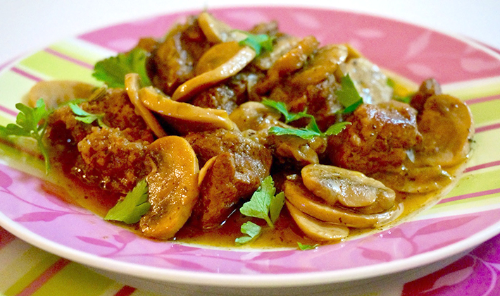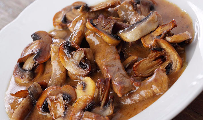 Mettre la viande préparée dans un plat, verser la sauce aux champignons et parsemer d'herbes hachées.