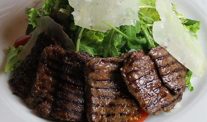 Placer le risotto aux champignons tout préparé dans des assiettes à bords relevés et y déposer des médaillons de bœuf tout prêts.