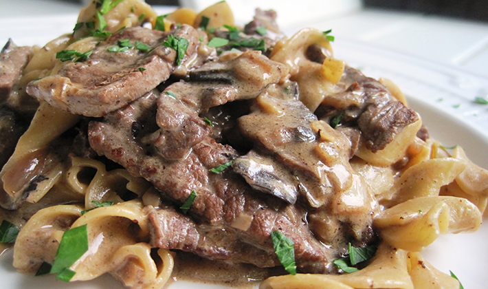 Le bœuf dans une sauce blanche aux champignons est préparé à partir des composants suivants:
