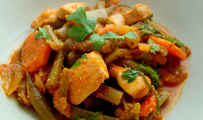 Ragoût de boeuf aux aubergines, aux champignons et aux tomates.