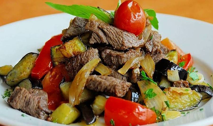 Couper les aubergines et les tomates en cercles, les faire frire dans l'huile et les placer alternativement à côté de la viande comme plat d'accompagnement.