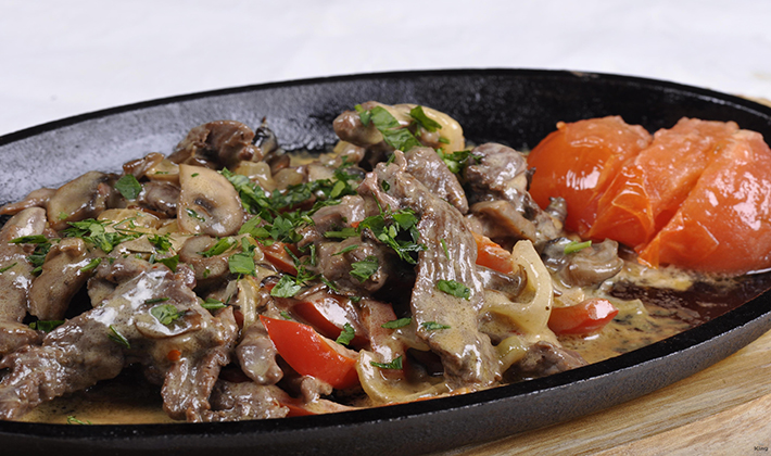Peler la viande des films, couper en tranches, saler, poivrer et faire frire dans une poêle bien chaude des deux côtés. Séparément, faites frire les champignons, les oignons et les tomates cuits. Faire bouillir et faire frire les pommes de terre, puis mettre la viande dans une casserole, y mettre les champignons, les oignons et les tomates, et ensuite les pommes de terre frites, verser la crème sure et saupoudrer de fromage râpé. Mettez le boeuf aux cèpes au four pendant 45 minutes. Avant de servir, saupoudrer de persil. Assurez-vous de servir sur la table dans une casserole.