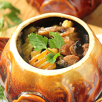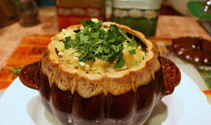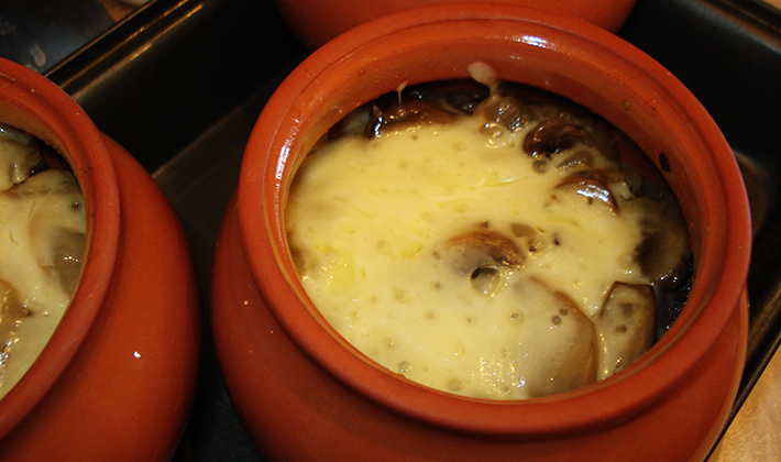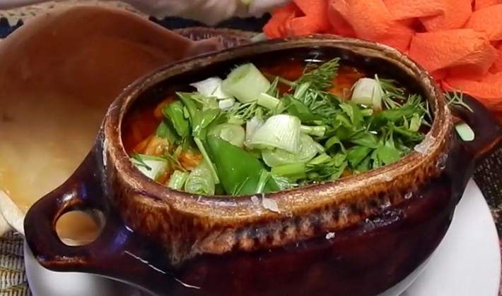 Mettez les légumes sautés avec les champignons dans un grand plat en argile, ajoutez le bouillon de champignons chaud avec les pommes de terre bouillies (ajoutez de l'eau bouillante si nécessaire), ajoutez le chou haché, le poivron et les champignons hachés, ajoutez du sel et des épices.