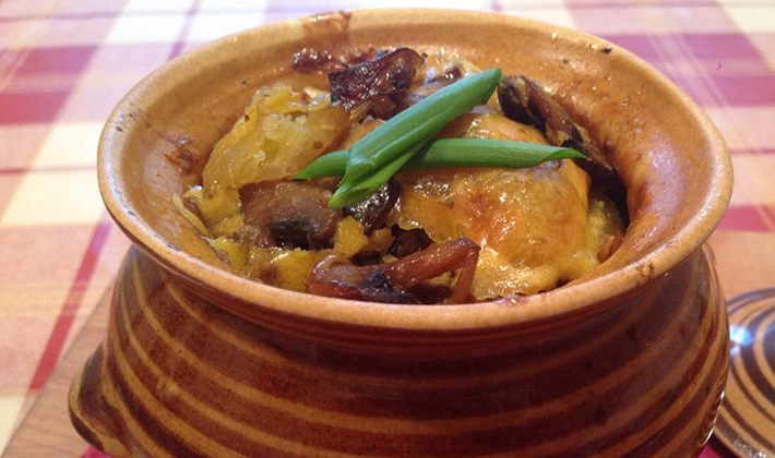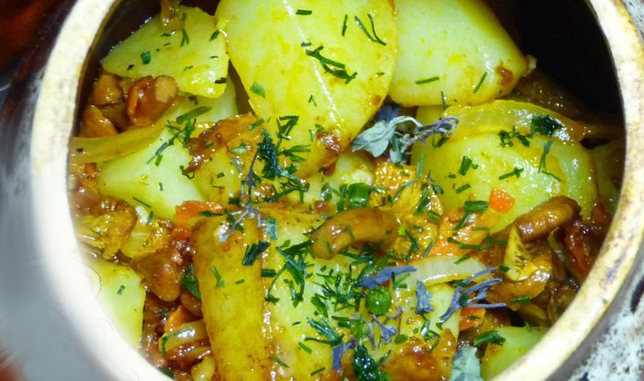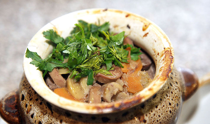 Pour cuire les pommes de terre avec les cèpes dans des casseroles, les peler, les verser sur de l'eau bouillante et les hacher. Couper la graisse en petits cubes, mettre dans une casserole et faire fondre. Coupez la viande de lapin en petits morceaux et faites-les frire dans la graisse jusqu'à ce qu'ils soient dorés, puis mettez les oignons et les carottes hachés et faites-les frire avec la viande, mettez-les dans un grand pot en céramique, ajoutez les champignons et le poivron hachés, ajoutez de la purée de pâte de tomate, du sel et des épices, versez à chaud l'eau et le vin. Couvrir la casserole remplie, mettre au four, porter le bouillon à ébullition et cuire la soupe jusqu'à ce que la viande soit prête. Servir avec de la crème sure et des herbes fraîches.