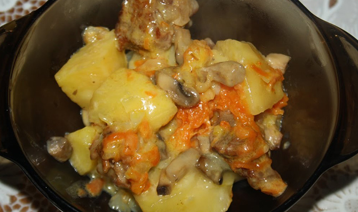Couper le veau en portions et laisser mijoter avec les champignons hachés dans une poêle avec l'huile végétale jusqu'à ce qu'ils soient à moitié cuits. Épluchez les pommes de terre et les carottes, coupez-les en cubes. Rincez bien les légumes verts, hachez-les. Mettez la casserole de viande et les champignons dans une casserole, ajoutez les pommes de terre et les carottes, la verdure hachée, le sel, le poivre, versez le bouillon chaud, couvrez et mettez au four modérément chauffé pendant 45 minutes.