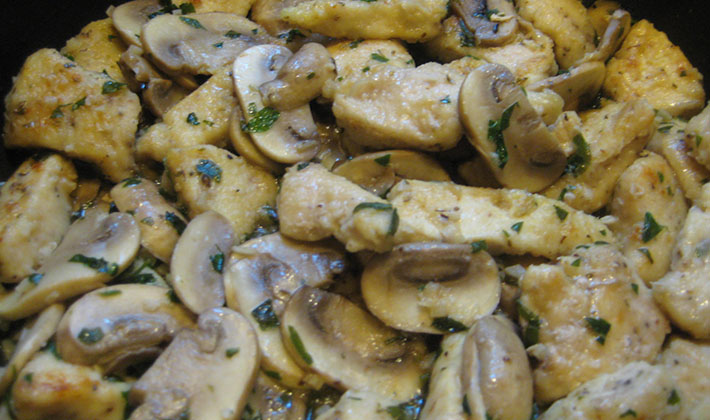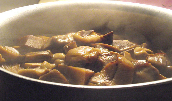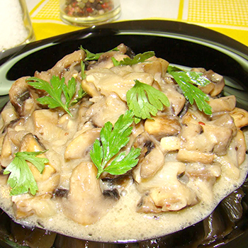 Chauffer l'huile, y mettre les champignons coupés en deux (ou hachés en fines tranches) et l'oignon haché. Verser le bouillon dans les champignons bouillis, laisser mijoter les champignons frais dans leur jus pendant 15 à 20 minutes. En fin de cuisson, ajoutez du sel, des verts, de la crème sure.Servir les pommes de terre bouillies et une salade de crudités pour la garniture.