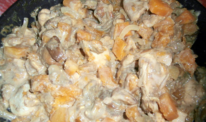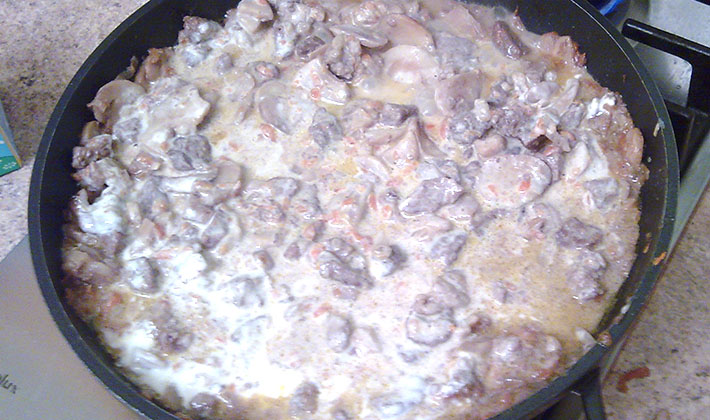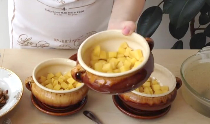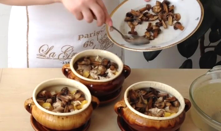 Couper le bœuf préparé en petits morceaux, saupoudrer de sel, poivre, faire frire, mettre dans une casserole et laisser mijoter jusqu'à tendreté avec les carottes, les oignons dans le bouillon de viande. Faire bouillir les champignons, les hacher et les faire revenir avec des oignons. Couper les pommes de terre et les faire frire.Dans des casseroles, mettre les pommes de terre, les ragoûts, les champignons avec les oignons, verser la crème sure, le bouillon de champignons et cuire au four.