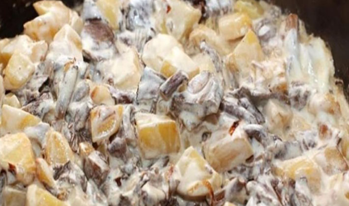 Épluchez les champignons, rincez et pendant 5 à 6 minutes. baisser dans l'eau bouillante. Puis déposez-le dans une passoire et laissez l'eau s'écouler. Couper les champignons en tranches, les mettre dans une casserole profonde, verser la crème sure. Ajouter la purée de tomates, le sel, le poivre et le laurier dans la même poêle.Mettez la casserole sur feu moyen et laissez mijoter un peu (7-10 minutes). Épluchez les pommes de terre, lavez-les, coupez-les en tranches, faites-les frire, mélangez-les avec des oignons frits hachés et combinez avec des champignons. Couvrir la poêle et laisser mijoter jusqu'à ce que tous les produits soient cuits. Au moment de servir, saupoudrer d'herbes. Les chapeaux de champignons bouillis peuvent être humidifiés avec un œuf battu, la chapelure, frits dans l'huile, puis mis au four et les faire frire. Au moment de servir, verser le beurre fondu sur la table. Servir avec de la purée de pommes de terre ou des pommes de terre frites.