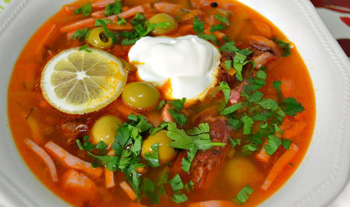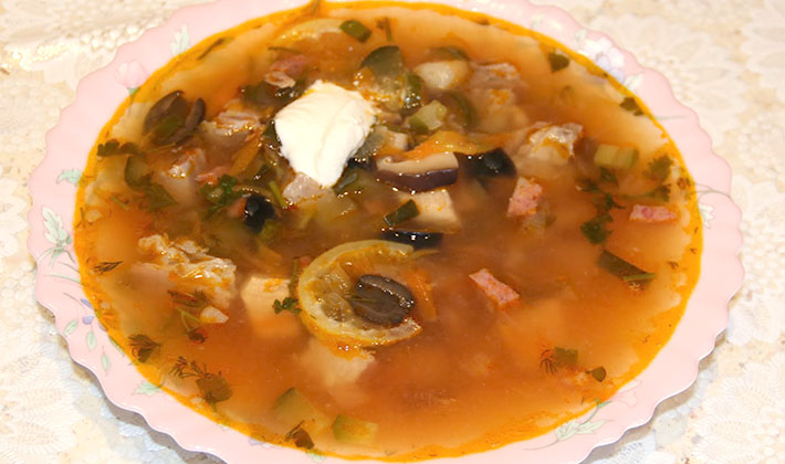 Champignons, oignons, persil (ou céleri) coupés en lanières et laisser mijoter dans l'huile. Ensuite, versez le bouillon et faites cuire pendant 10-15 minutes. Avec les cornichons, couper la peau et enlever les graines avec une couche mince. Couper les concombres et les tomates en petits morceaux, les baisser avec les câpres (ou les olives) dans une soupe chaude et les faire bouillir pendant quelques minutes. Au moment de servir, mettre la crème sure dans un plat, parsemer d'herbes hachées et ajouter le citron.