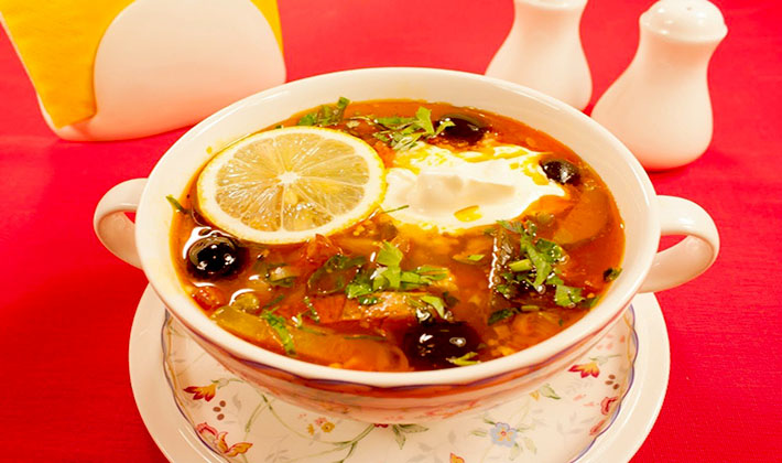 Dans le bouillon de champignons mettre les oignons, sautés dans la sauce tomate, les cornichons tranchés et cuire pendant 10 minutes. Puis déposez les champignons bouillis et hachés, coupés en lanières, sel, poivre, feuille de laurier, porter à ébullition, mettre les olives dénoyautées et dénoyautées, porter à nouveau à ébullition. Avant de servir, assaisonnez le plat avec de la crème sure et du persil, ainsi que deux tranches de citron.