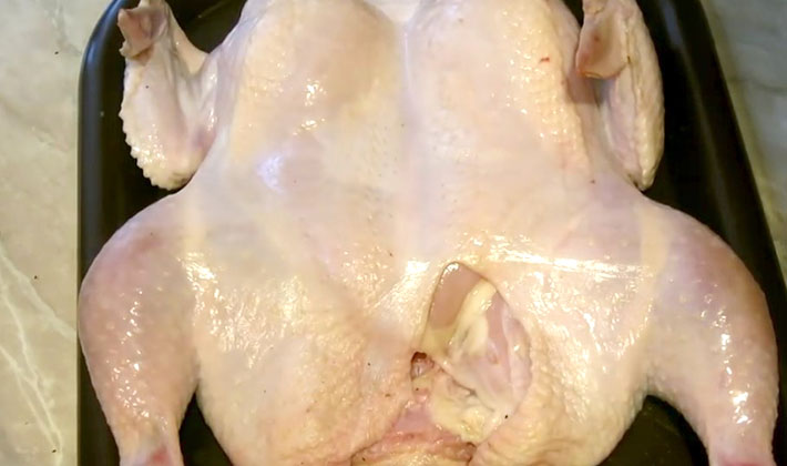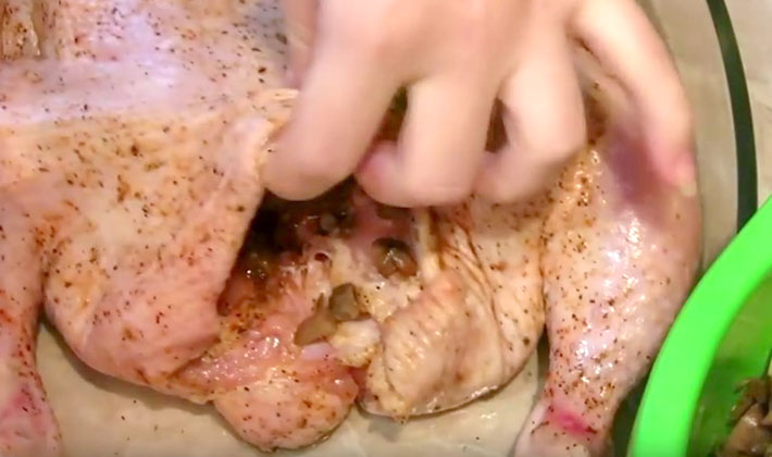 La viande hachée n'est pas très serrée pour remplir la peau du poulet, rentrez-la à la place des découpes afin que la viande hachée ne soit pas visible (vous pouvez la coudre avec du fil).